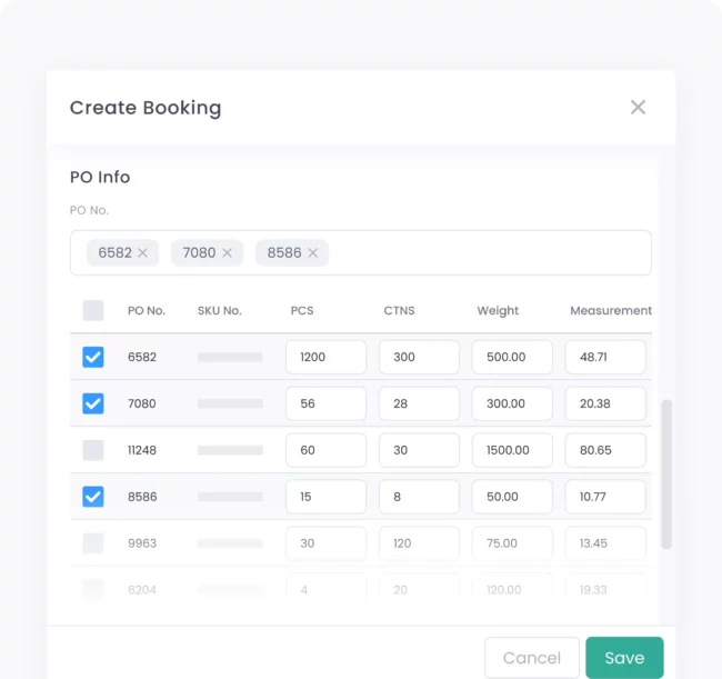 Avoid the back-and-forth emailing for PO bookings. Assign POs to a new booking just by selecting them, and collaborate with suppliers directly on specifics like booking approvals, quantities, must-book-by, and cargo-ready dates in one system.