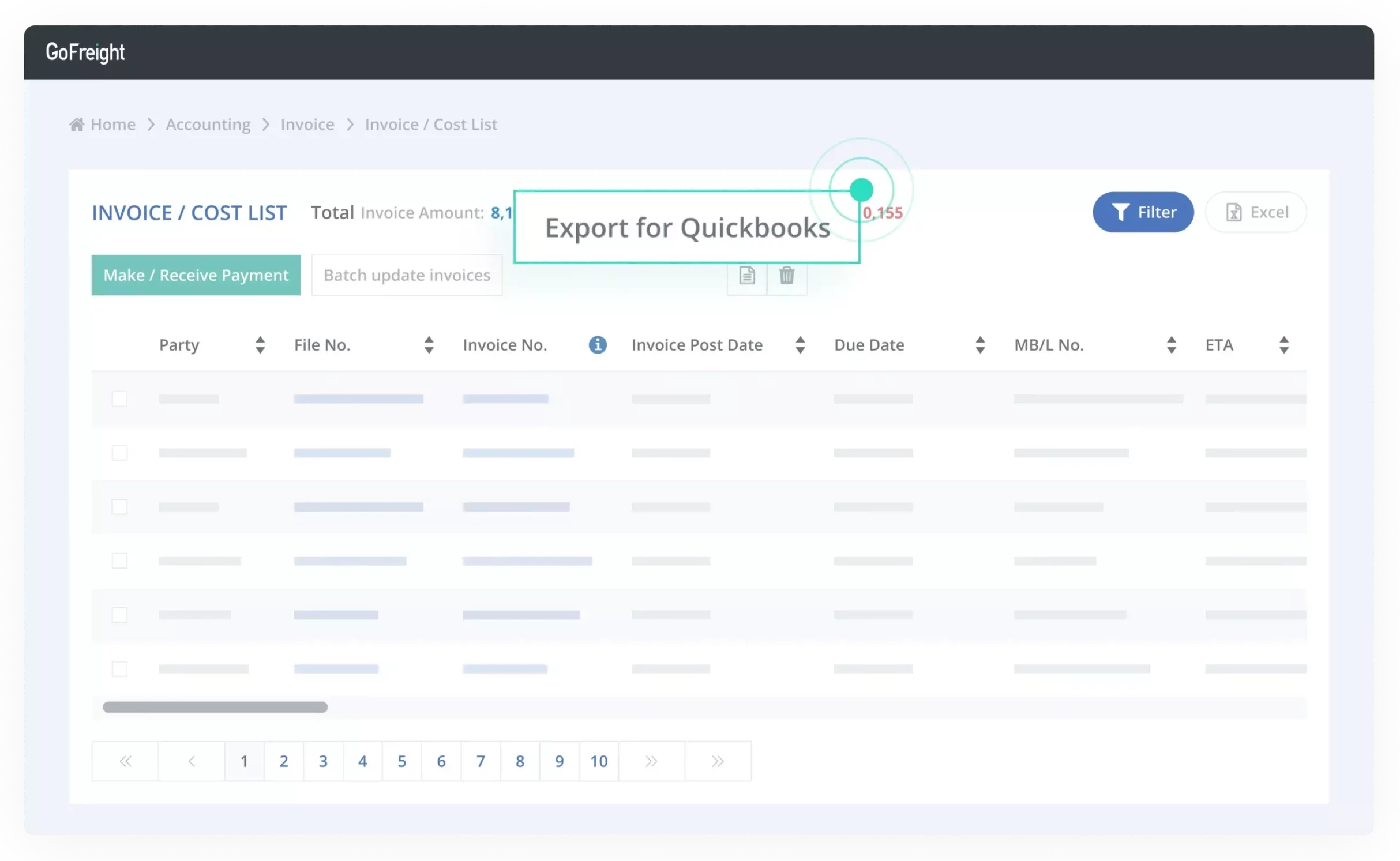 Avoid double entries simply by exporting the invoice/cost list on GoFreight and syncing data on Quickbooks in a few clicks. You will be reminded when an invoice is changed or updated.