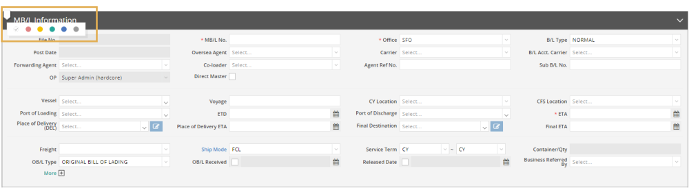 The color mark can now also be changed in the shipment entry view. On the top left corner of MBL/HBL in ocean import, ocean export, air import, and air export, there will be a bookmark icon showing the color mark of that bill of lading. You can click on it and there will be a list of colors for you to choose.