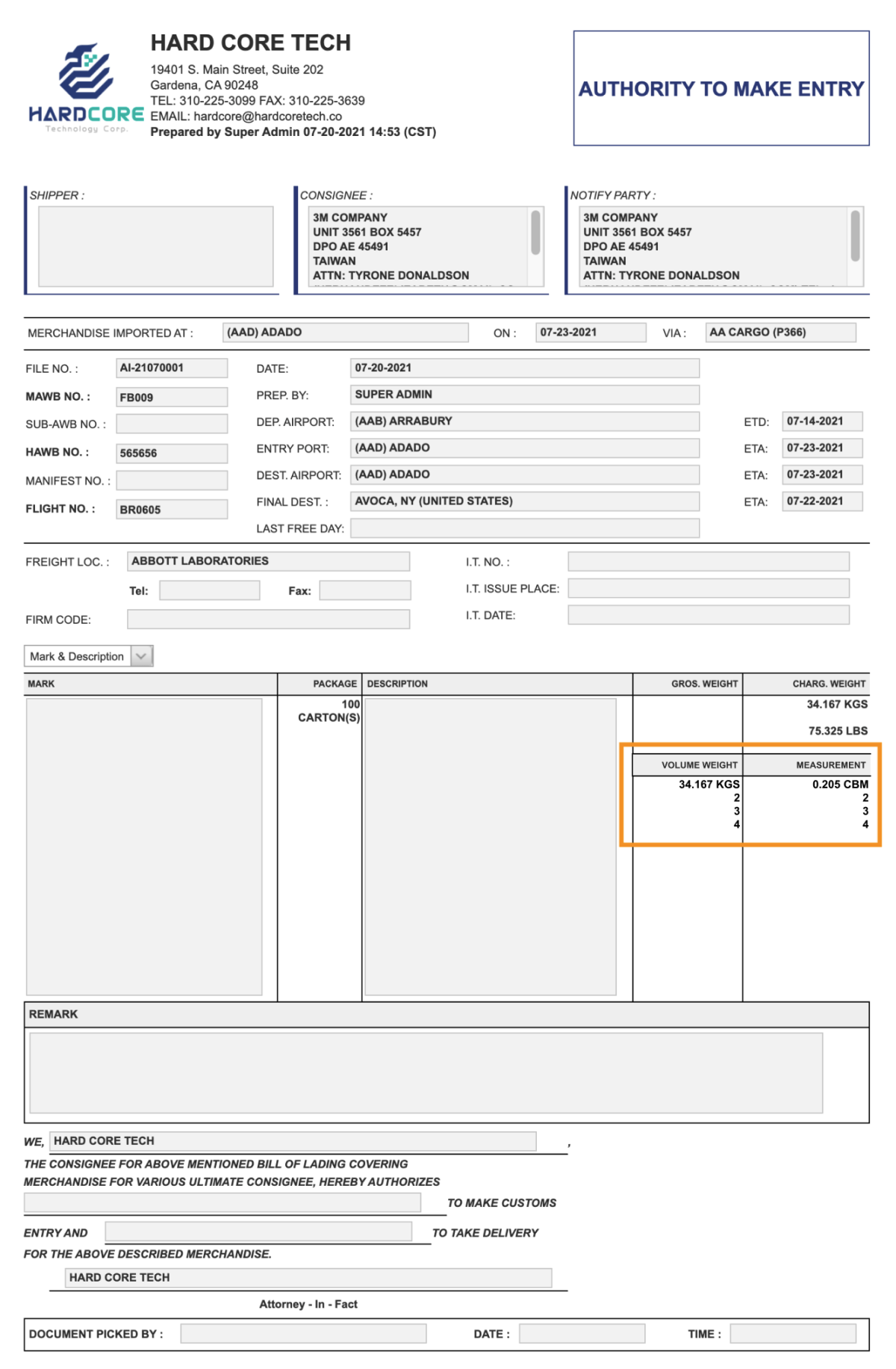 When viewing the arrival notice and authority forms for air import, the details of the Volume Weight and Measurement are now shown in addition to the existing Gross Weight and Changeable Weight sections.