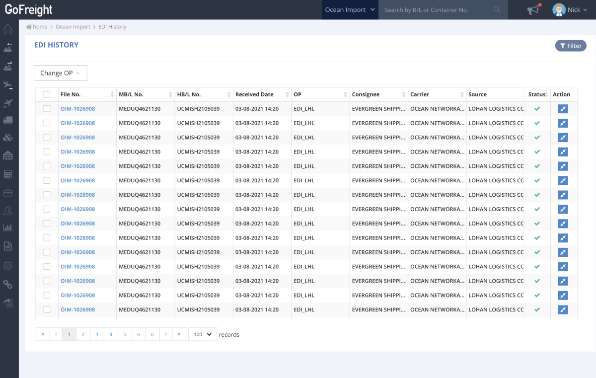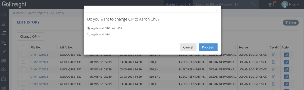 In the EDI history view under Ocean Import, the list view will show more important columns, such as MB/L No., HB/L No., Consignee, and Carrier, for you to decide how to assign these shipments to different OPs.