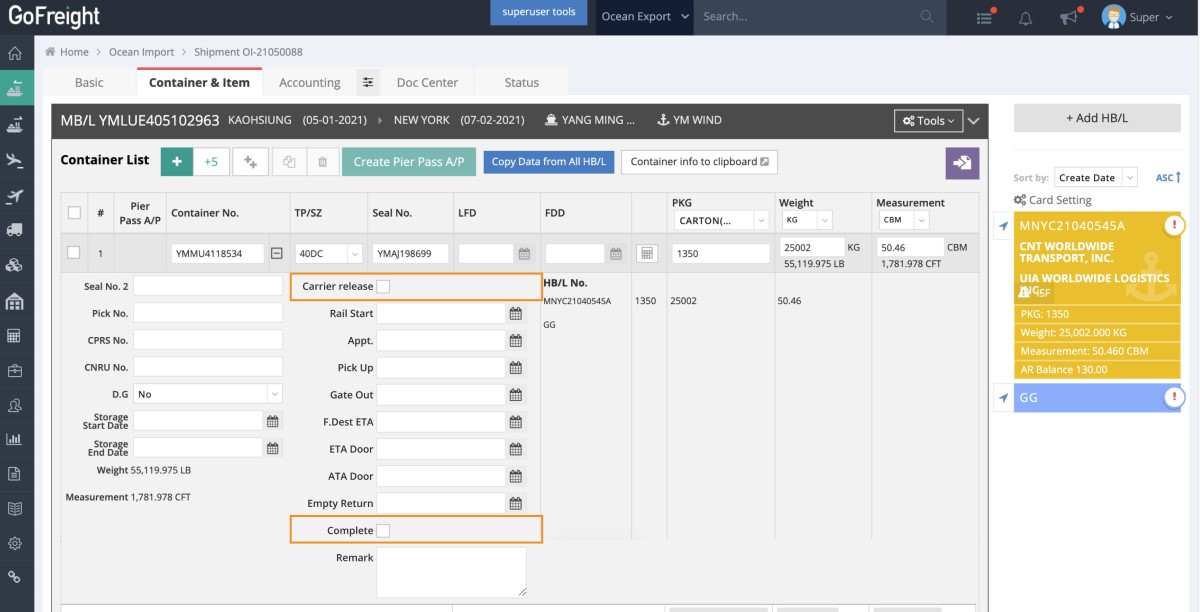 In the Container & Item tab of Ocean Import MB/L, two checkboxes, namely Carrier Release and Complete, to mark whether the carrier has released the container or the operation of this container has been completed.